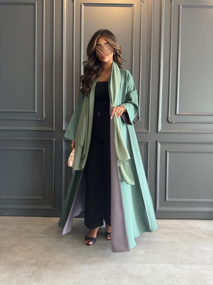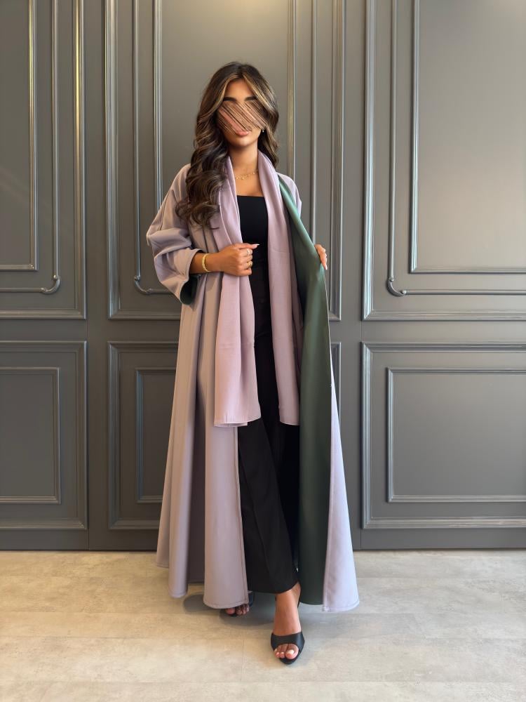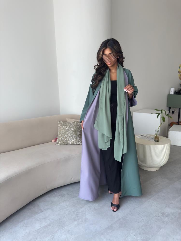 عـبـايـة " دبـل فـيـس " مـلـونـة بـلـون الأخـضـر و الـبـنـفـسجـي الـفـاتـح ، بـقـمـاش كـريـب سـيـرامـيك ، بـقـصـة كـلـوش ، بـإضافة " طـرحـتـين " بـلـون الأخـضـر و الـبـنـفـسـجـي .