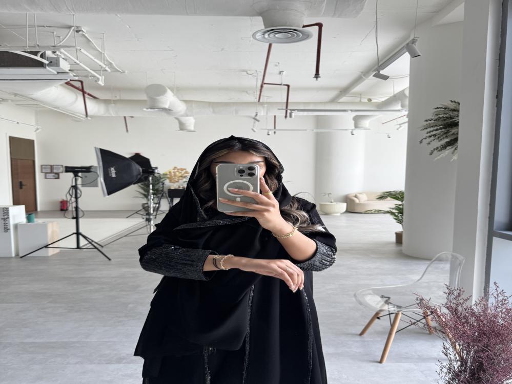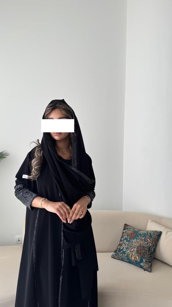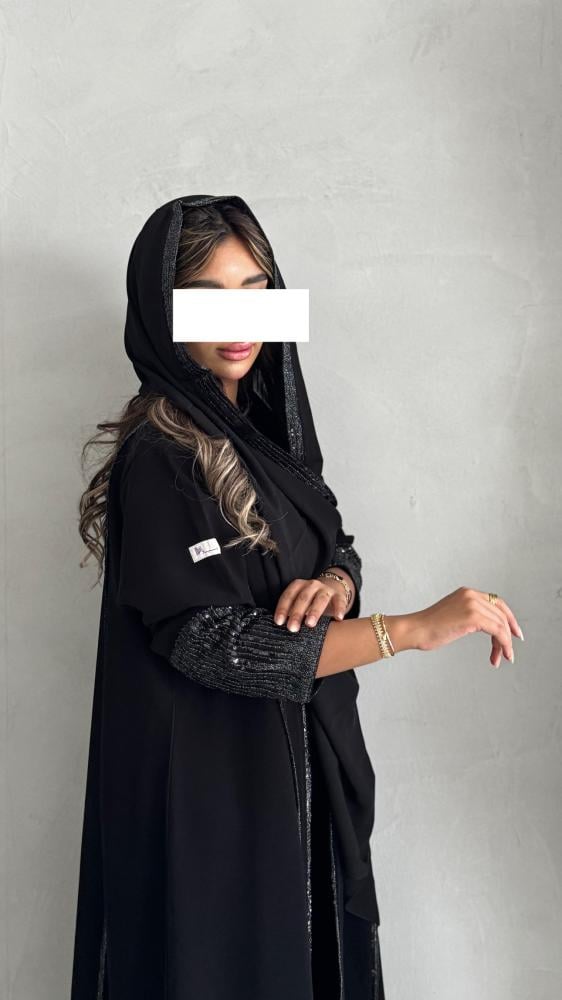 عبايــة ســوداء بـتدخــيـلات تُـل فـي الأكمــام بـقمـاش كــريــب مــلــكــي القــصــة: نـص كـلـوش