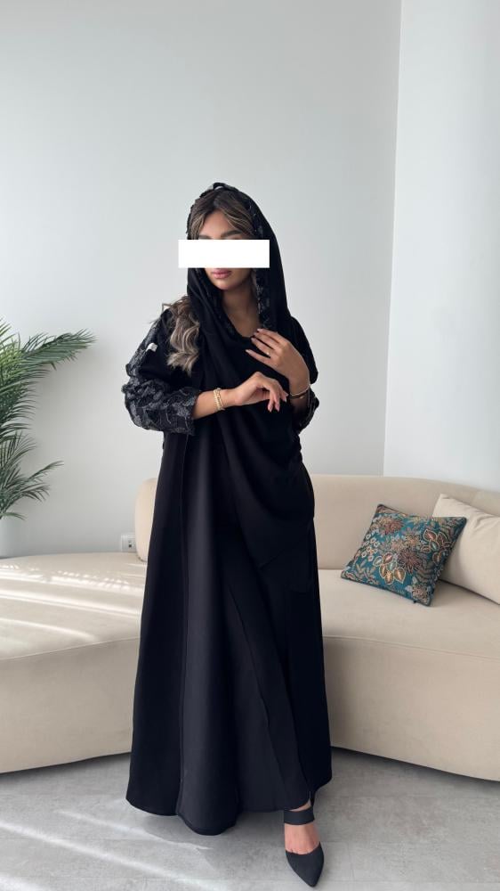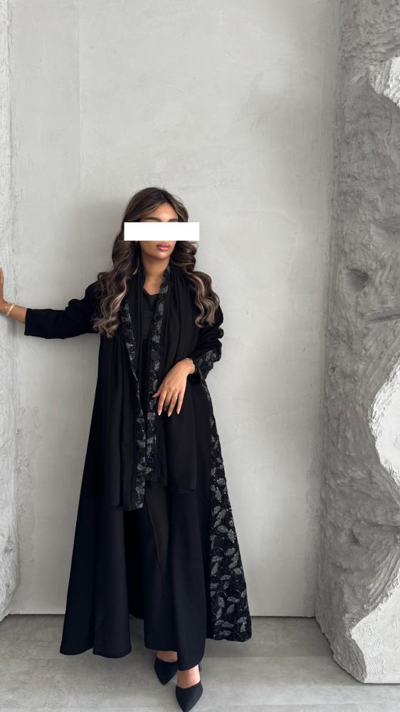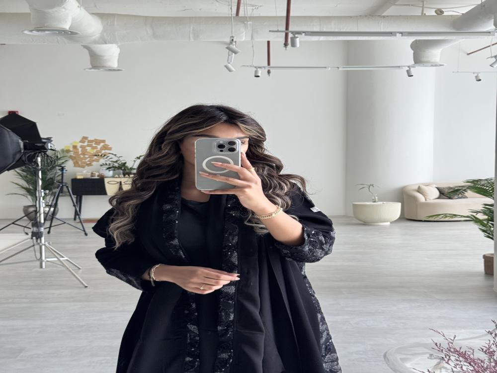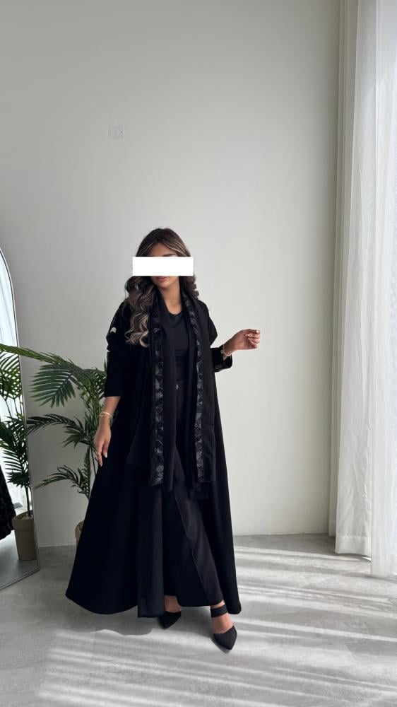 عبايــة ســوداء بـقـمـاش كــريــب مــلــكــي بـإضـافــة تـدخـيـلات تُـل مـن الـخـلـف