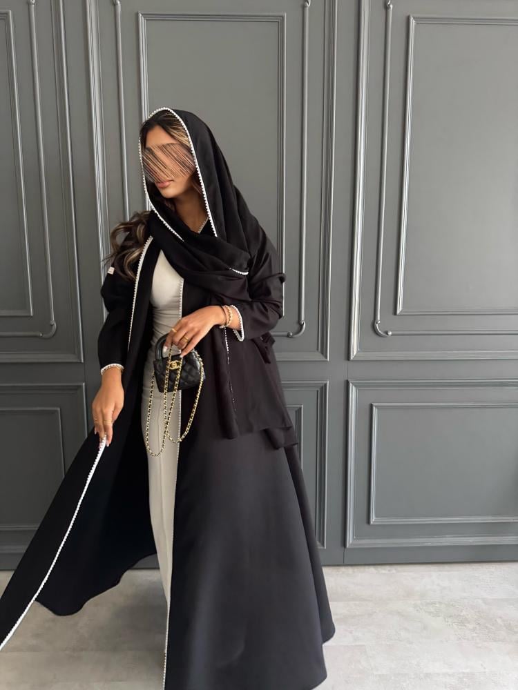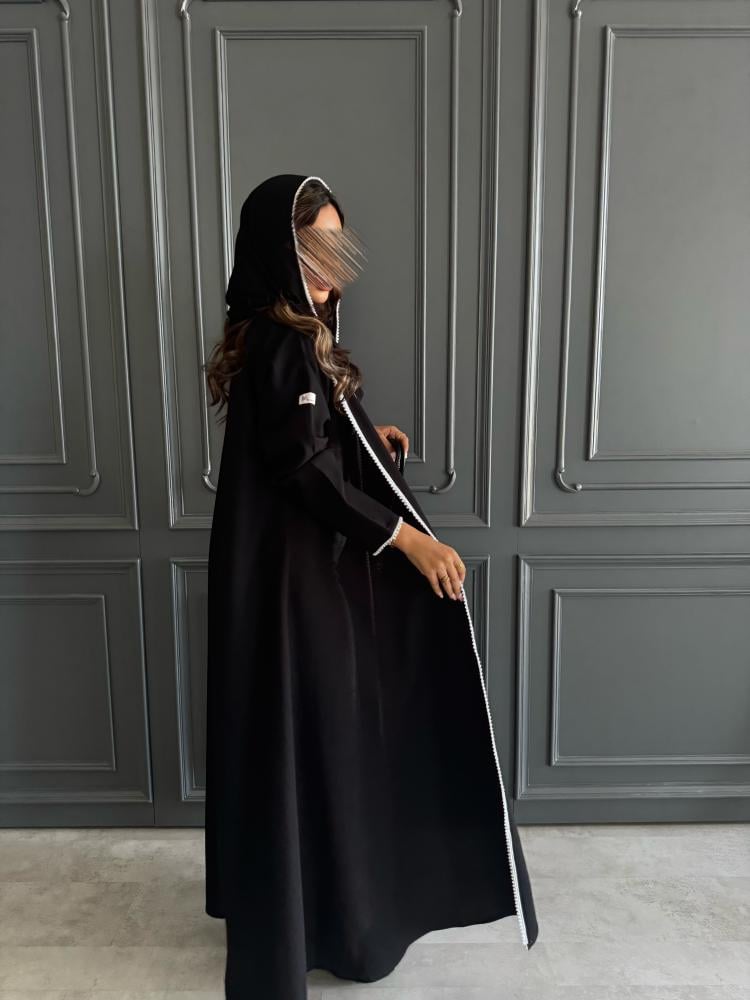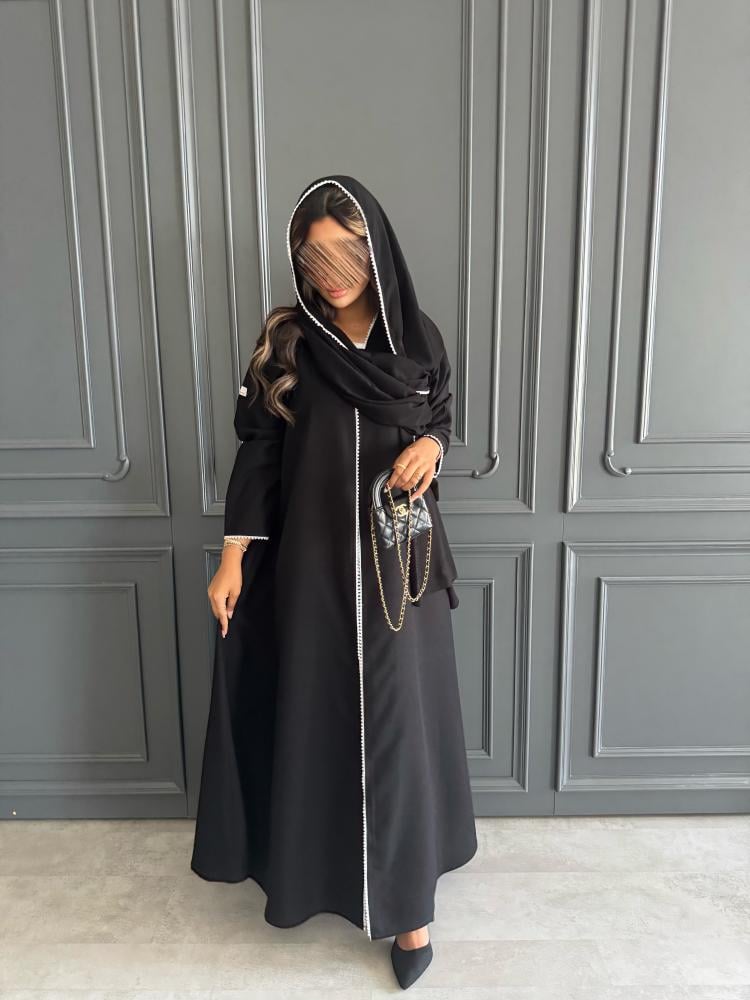 عـبايـة سـوداء ، بـقـمـاش كـتـان ، بــإضافة لـؤلـؤ فــي الــعــبــايــة ، بــطــرحة ســوداء بــطــرف لــؤلــؤ ، قــصــة الـعـبـايــة : نــص كـلـوش .