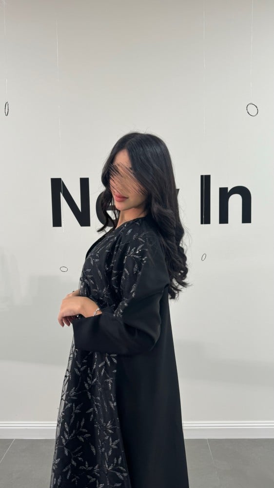 عباية سوداء بقماش كريب شمالي بإضافة تل من الأمام