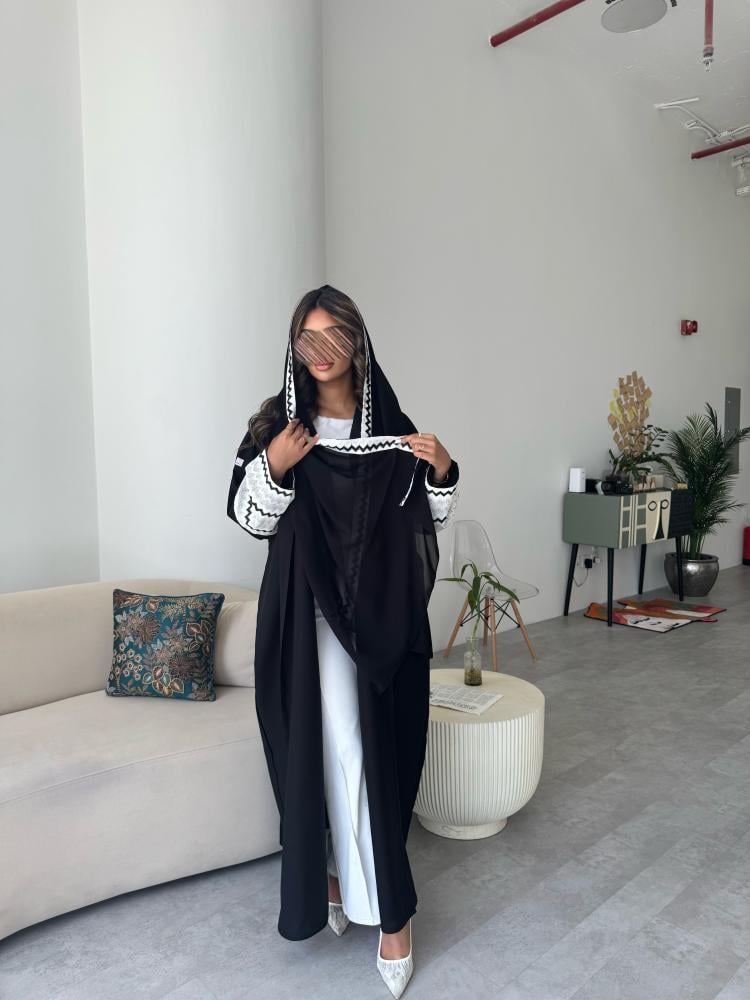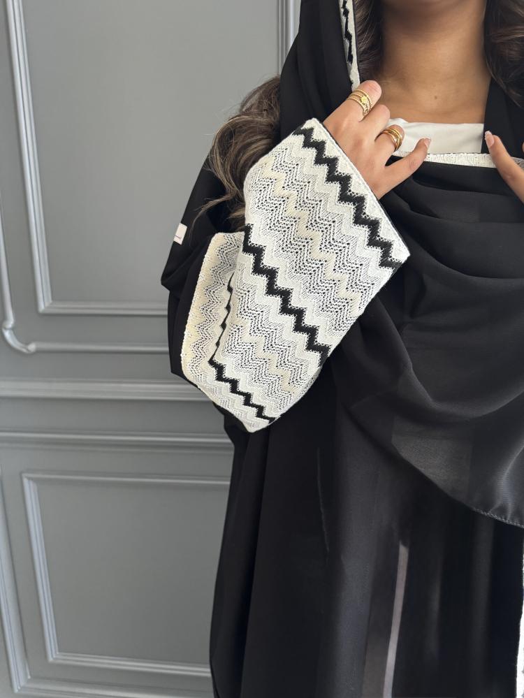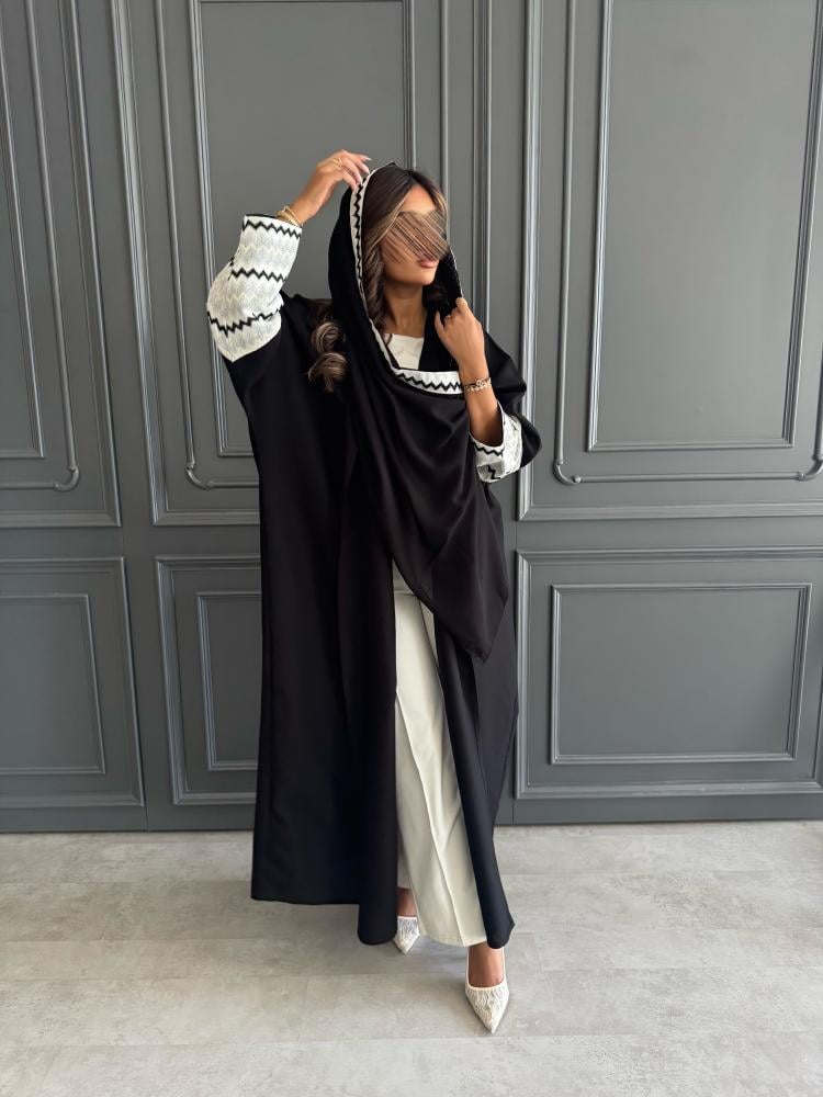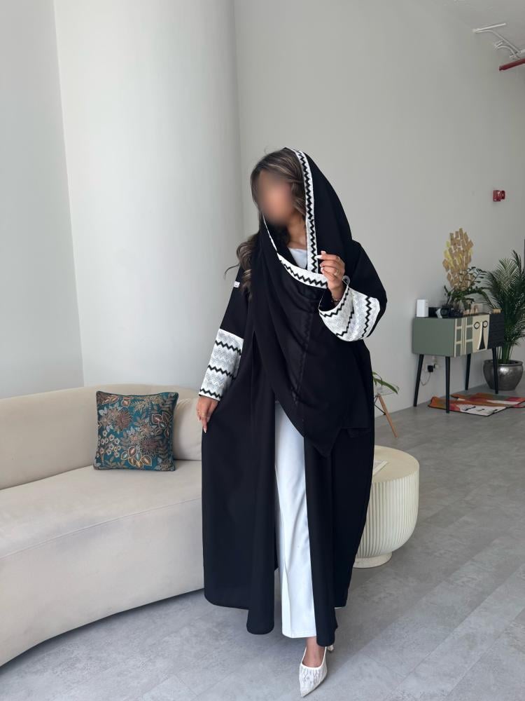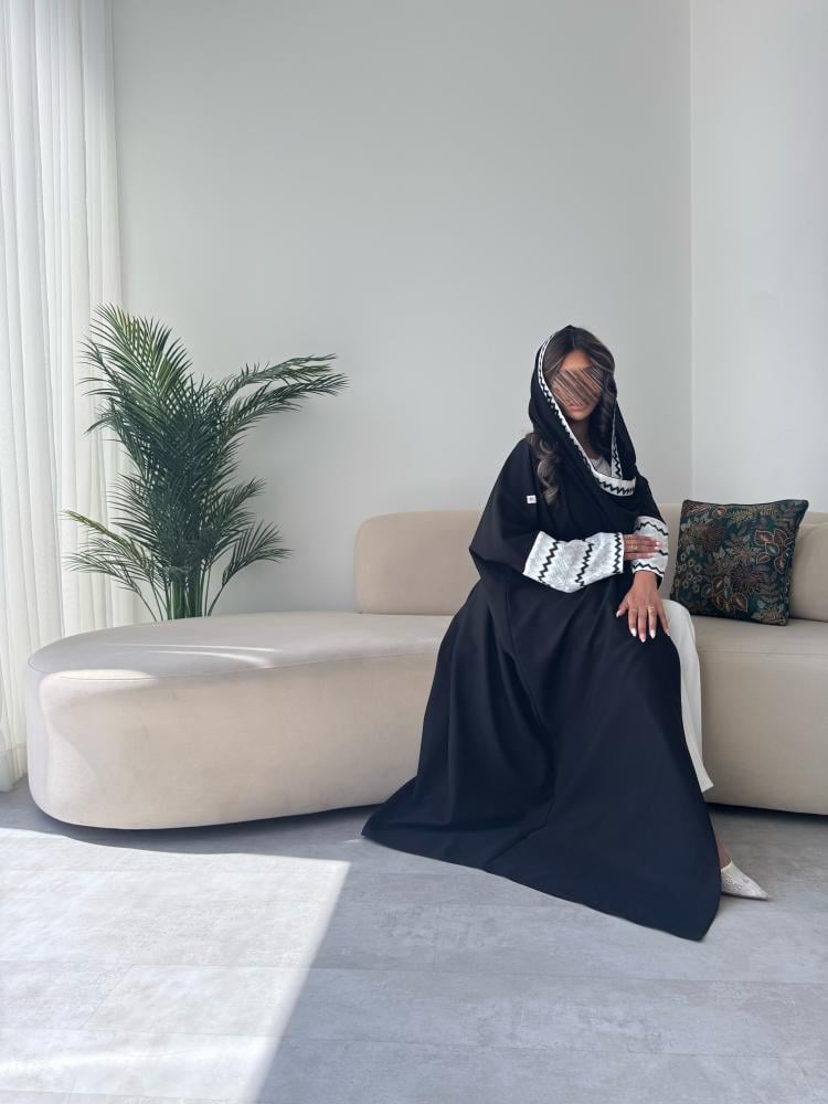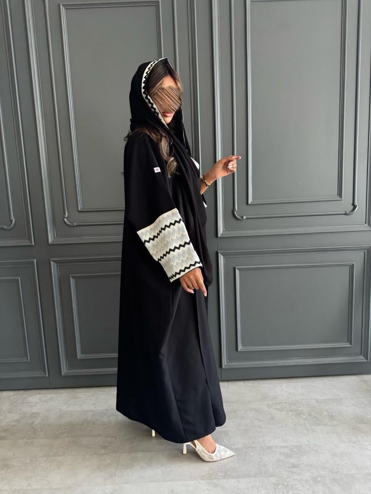 عـبـايـة سـوداء بـقـماش كـتـان بـإضـافة دانـتـيل فـالأكـمـام بــقــصــة : الــفــراشـــة ، بـــطــرحـة ســـوداء بـــطرف دانــتــيــل .