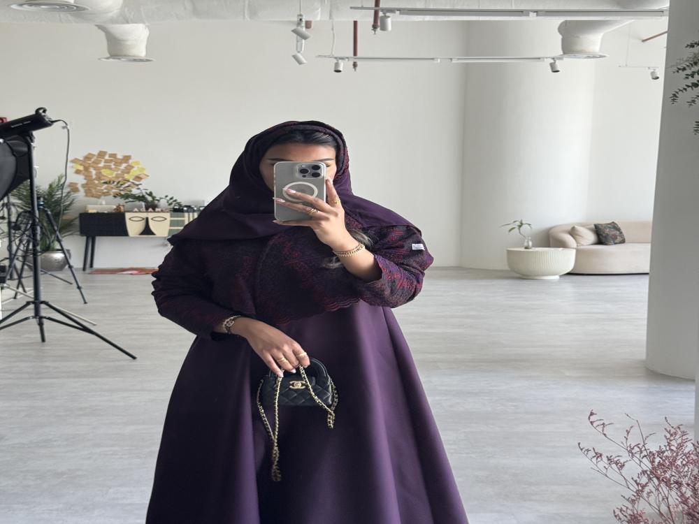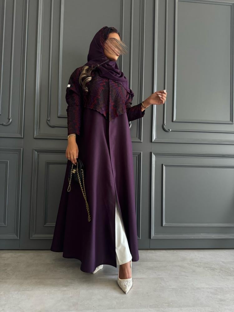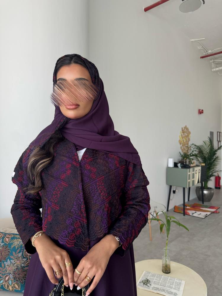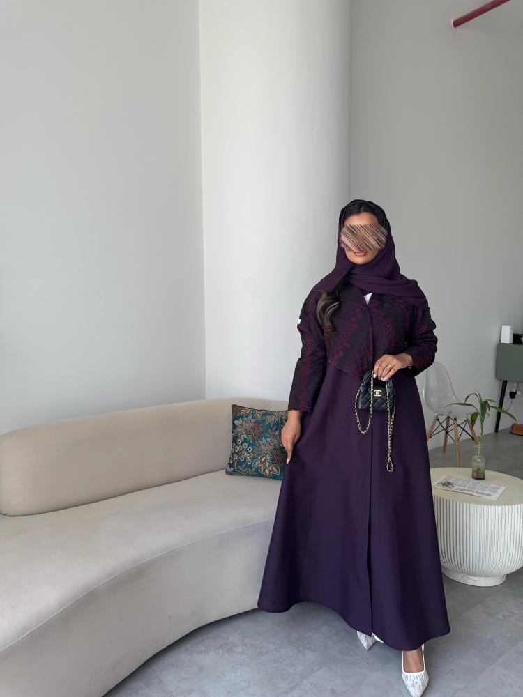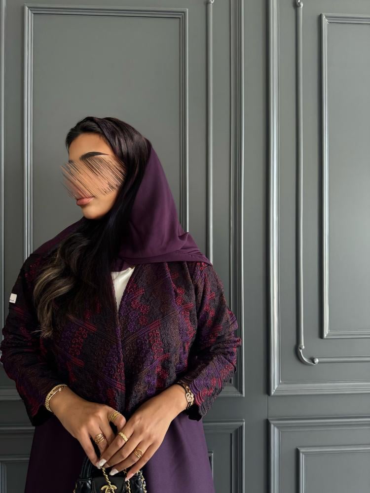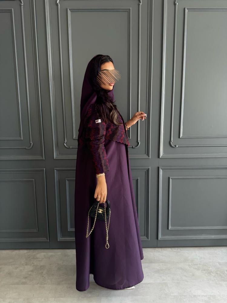 عـبـايــة بـنـفـسـجـيـه ، بـقـمـاش كــتان ، بــإضــافـة تــدخــيــلات ركــامه مــن الــخــلــف و الأمــام ، بــقــصـة : نـص كـلـوش ، بــطــرحــة بـنـفـسـجـيه بـطـرف ركـامه .