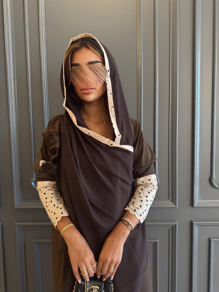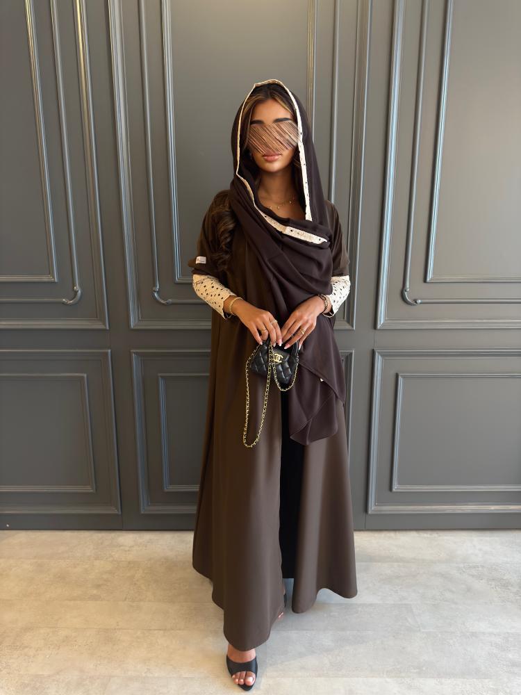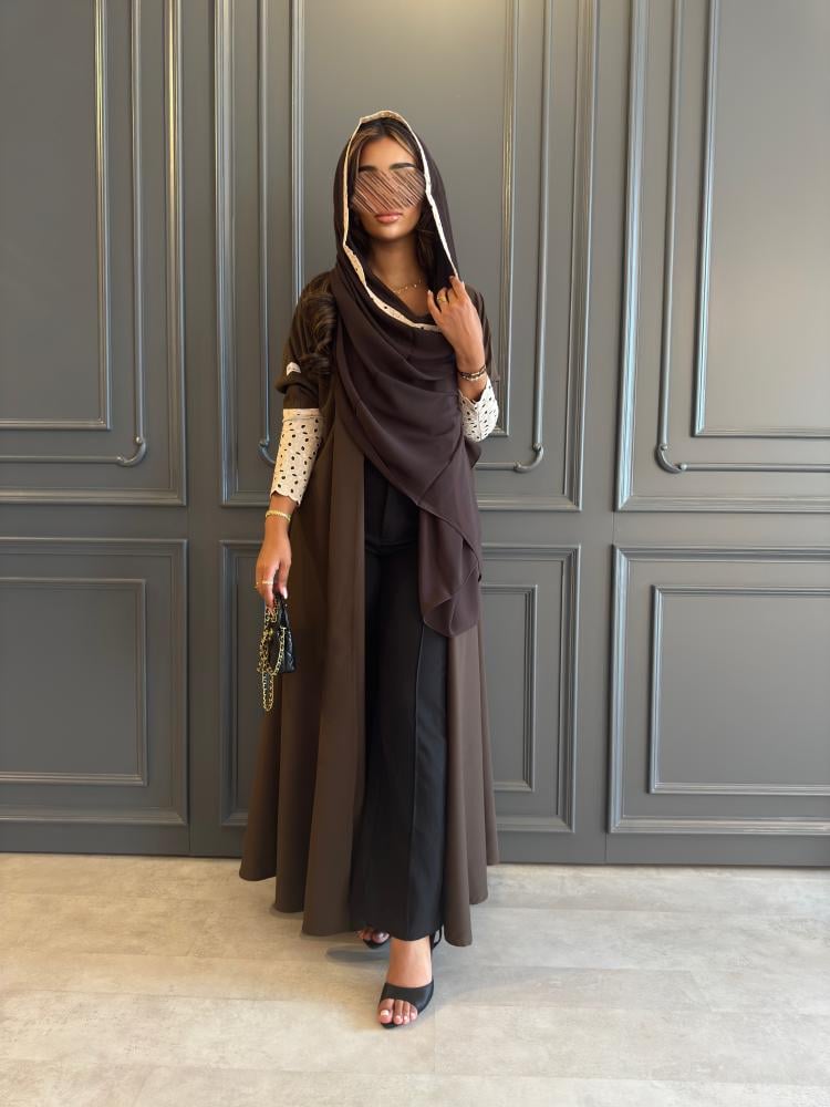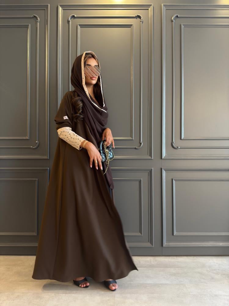 عـبـايـة مـلـونـة بـلـون بُـنـي بـإضـافـة تـدخـيـلات ركـامـة فـي الأكـمـام ، بـقـصـة نـص كـلـوش ، بــطـرحـة بُنـية بـطـرف ركـامـه .