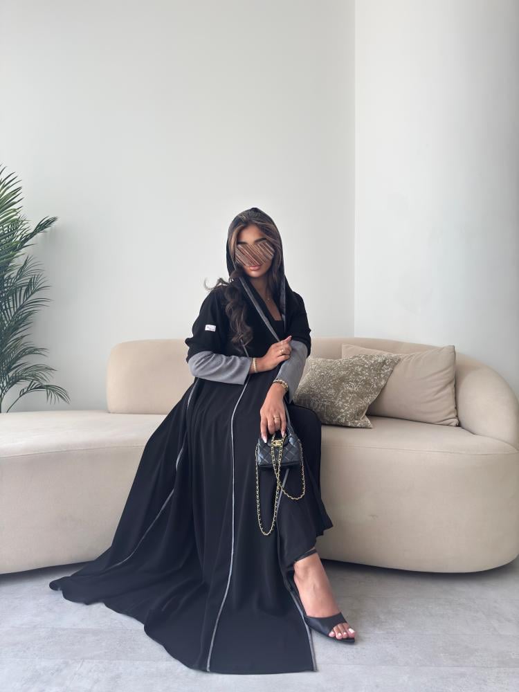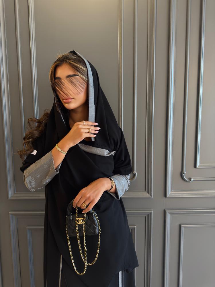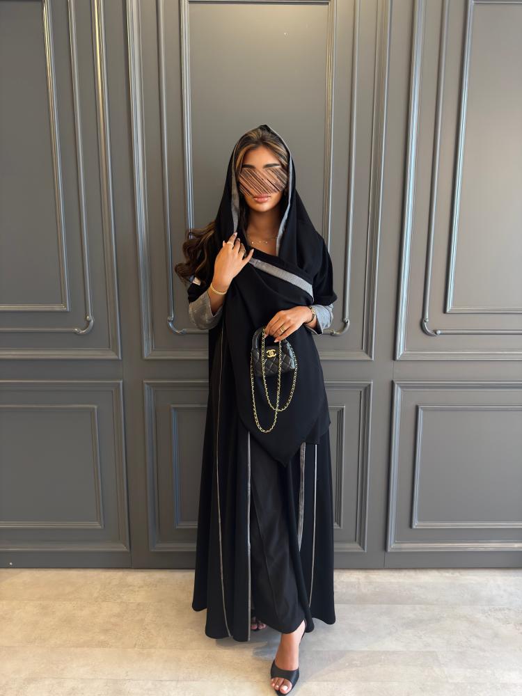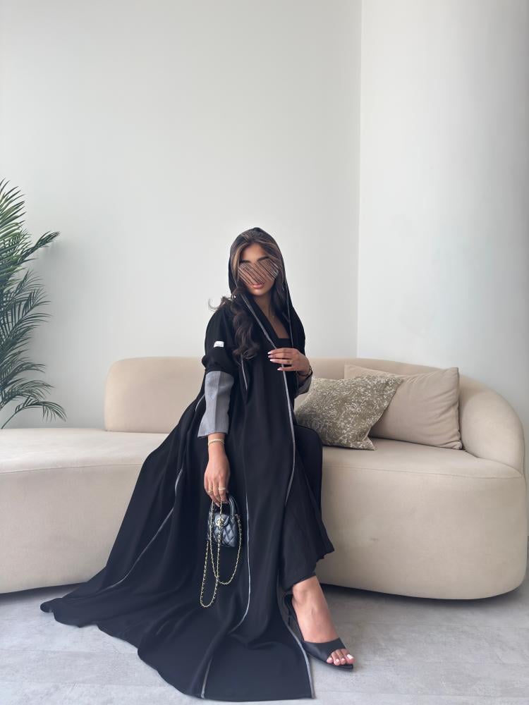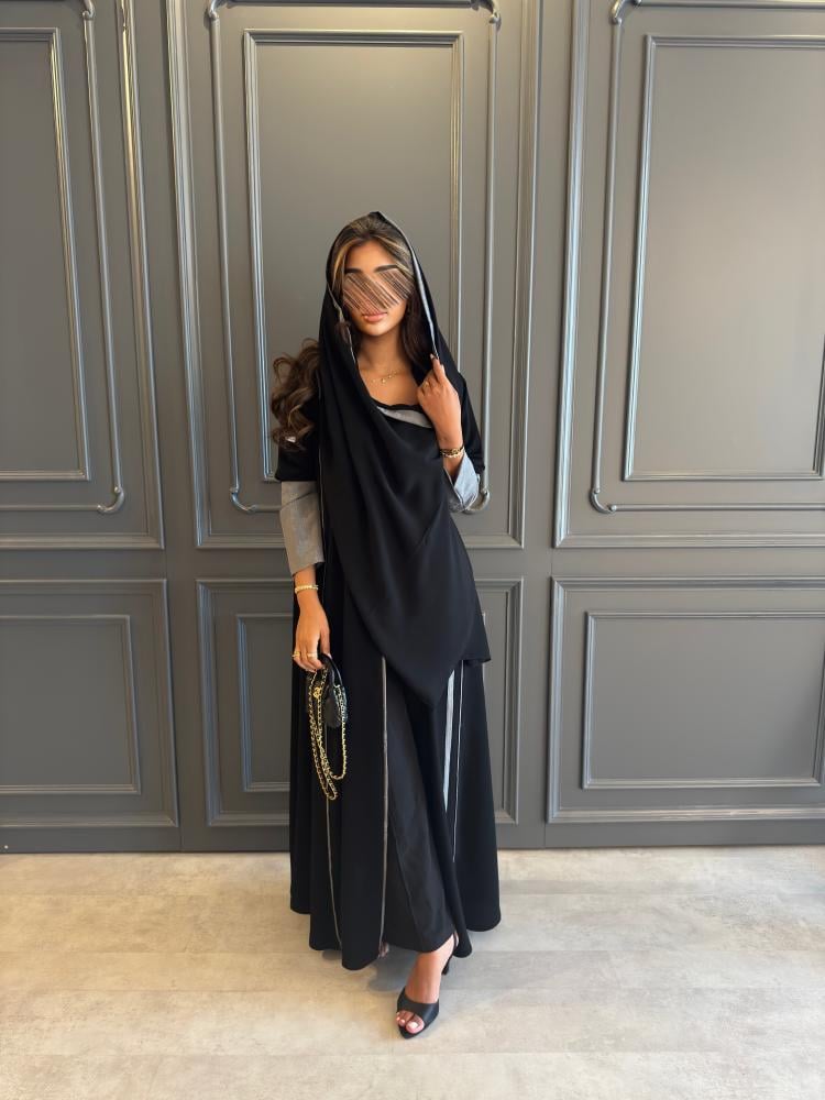 عـبـايـة سوداء بـقمـاش كـريـب مـلـكـي كـوري بـإضـافـة جـاكـار بـإلاكـمـام مـع إضـافـة خـطـوط بـالـعـبـايـة ، بـقـصـة نـص كـلـوش ، بــطـرحـة سوداء بـطـرف جـاكـار .