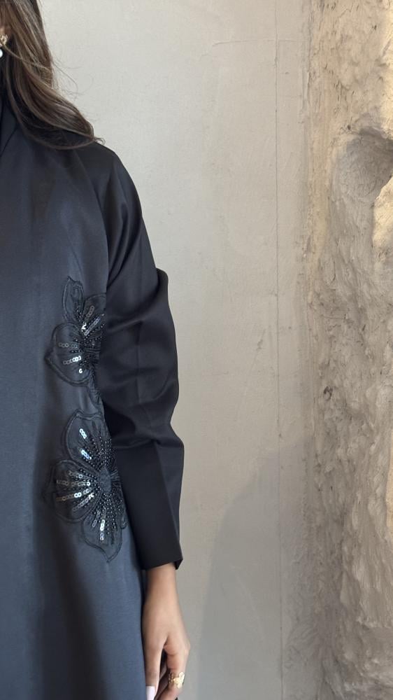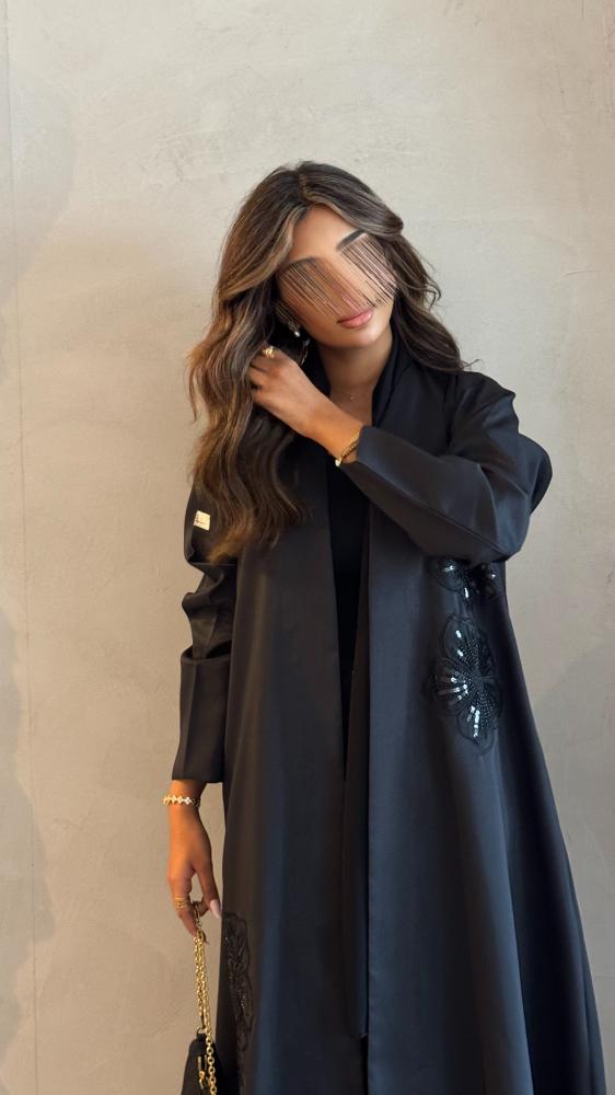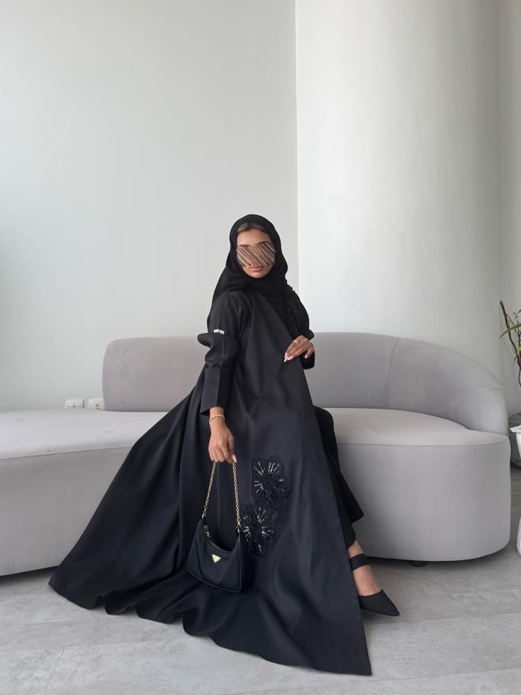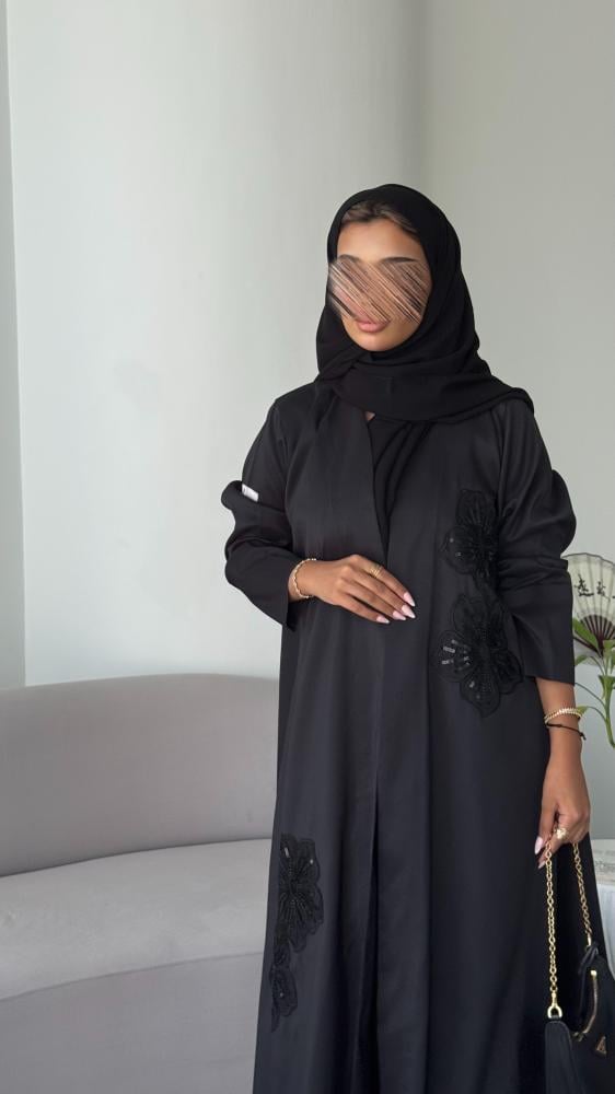 عـبـايـة ســوداء بـقـمـاش تـفـتـه ، بـإضـافـة تـطـريـز ورد من الأمـام فـقـط .