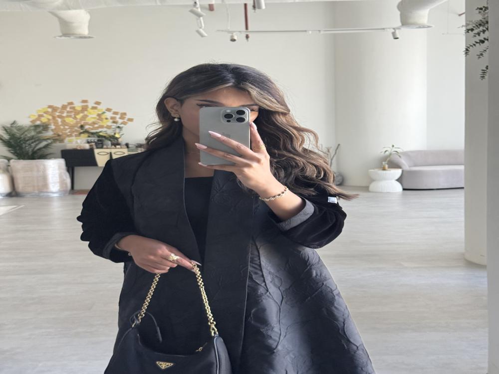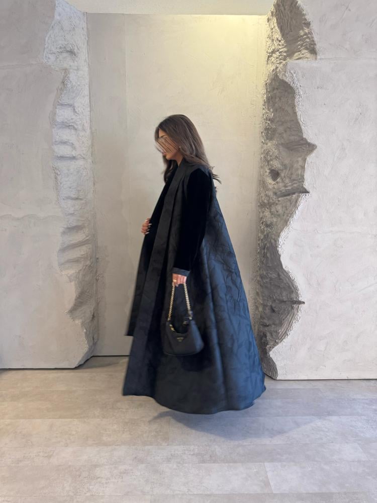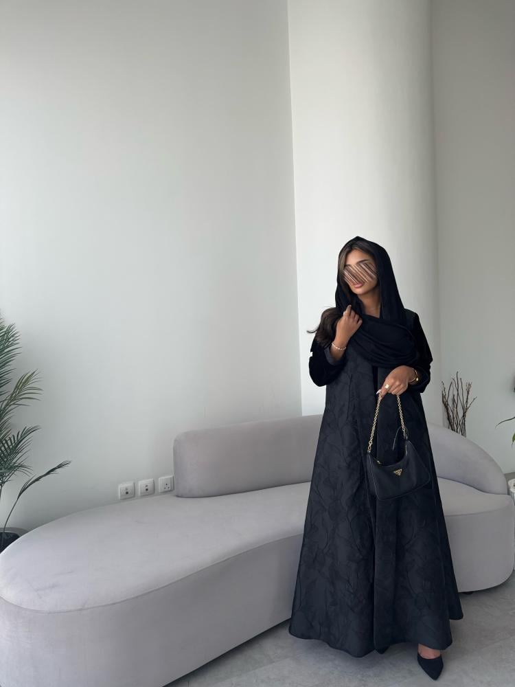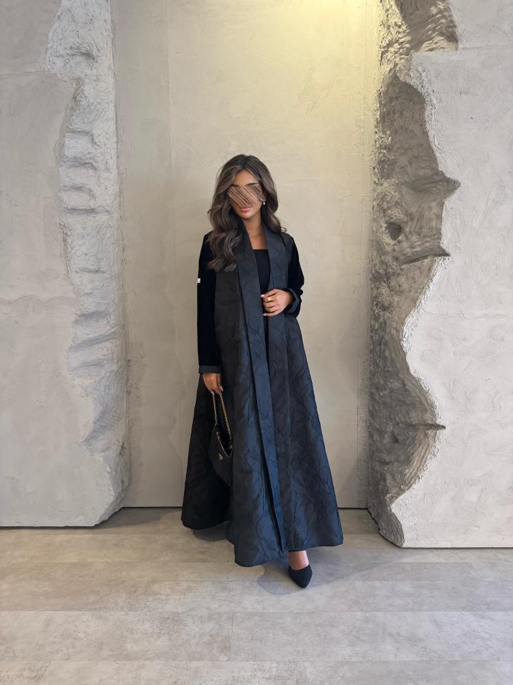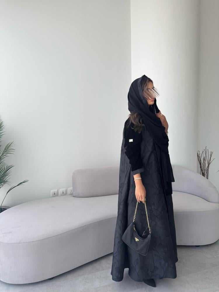 عـبـايـة سـوداء بـقـمـاش جـاكـار هـنـدي ، بـإضـافـة تـدخـيـلات مـخـمل فـي الأكـمام .